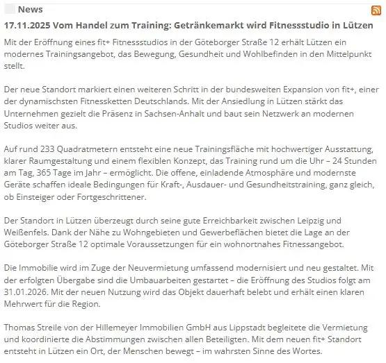 Thomas Streile von der Hillemeyer Immobilien GmbH aus Lippstadt begleitete die Vermietung und koordinierte die Abstimmungen zwischen allen Beteiligten. Mit dem neuen fit+ Standort entsteht in Lützen ein Ort, der Menschen bewegt – im wahrsten Sinne des Wortes.